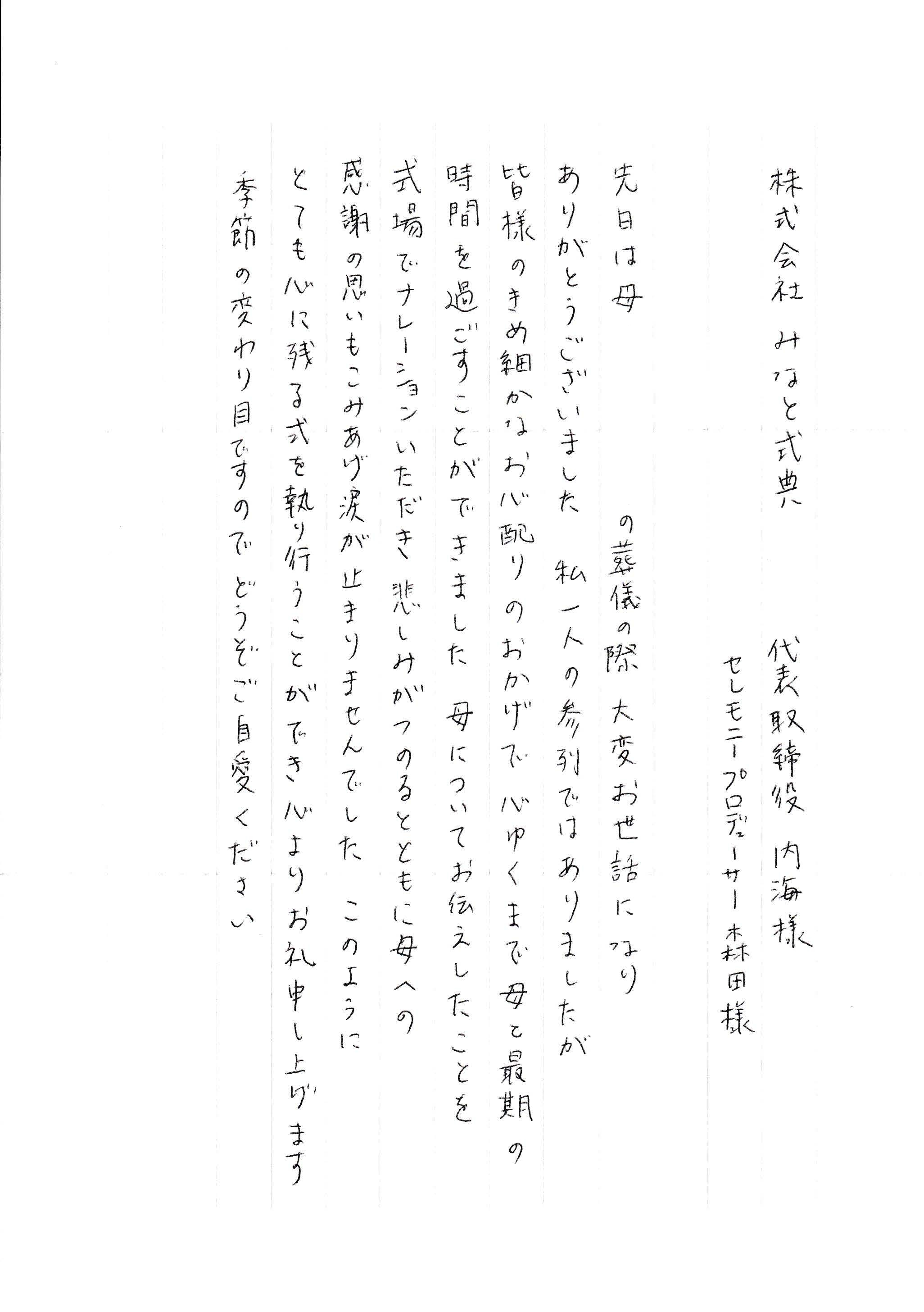 お客様先日は母の葬儀の際、大変お世話になりありがとうございました。